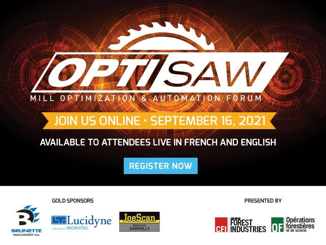 There’s just one week left until the OptiSaw 2021 Virtual Summit! Don’t miss your chance to learn all about the newest technology and processes that can help increase sawmill profitability. This FREE event, available with simultaneous French translation, takes place on Sept. 16 from 11:00 a.m. – 2:00 p.m. EST.