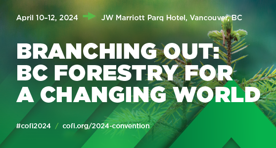 The BC Council of Forest Industries will hold the annual COFI Convention from April 10-12, 2024 at the JW Marriott Parq Hotel in Vancouver. Please join us for the largest gathering of the forest sector in Western Canada, as we gather industry, Indigenous, government, community and labour leaders from across the province to hear from compelling speakers and discuss key issues and opportunities facing BC’s forest industry.