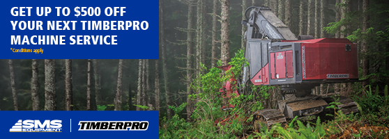 SMS Equipment now has exclusive dealer rights for TimberPro equipment in Western and Northern Canada. To celebrate, we're offering TimberPro machine owners a limited time offer to get up to $500* off your next service with SMS Equipment.