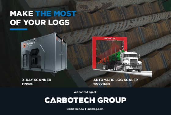 Recently, Carbotech Group has partnered with two high-tech companies operating in the international market that have developed innovative products for the sawmill industry. One of these companies is Woodtech from Chile. It offers a product, the Logmeter, which allows for the reading of the volume and quality of a log or length of wood directly on the trailers as they pass to the scale. The other company, Finnos from Finland, has developed an X-ray scanner that accurately reads the shape and internal and external defects of logs. Both companies already have operational installations in North America. Carbotech can sell and support these products in Canada and in United States.