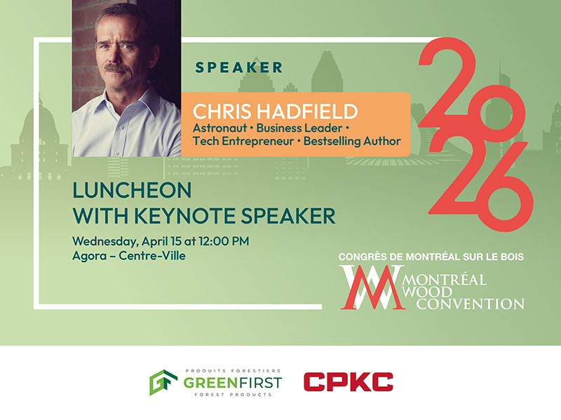 The Montréal Wood Convention is thrilled to announce that Colonel Chris Hadfield will be the Keynote Speaker at the Luncheon on Wednesday, April 15, 2026.