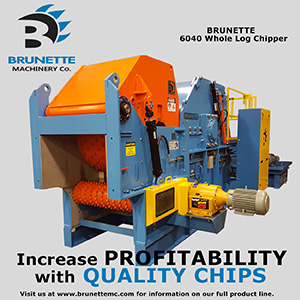 Brunette Machinery Company's innovative Chipper line-up includes a horizontal feed Whole Log Chipper capable of processing logs up to 24" Ø. This Chipper features a powered upper press roll and powered lower bedrolls that control log feed to ensure high quality chips. Two rotors are available for the WLC — the standard rotor for up to a nominal 1¼" pulp chip, and our new MicroChip rotor designed to produce a nominal ¼" chip.