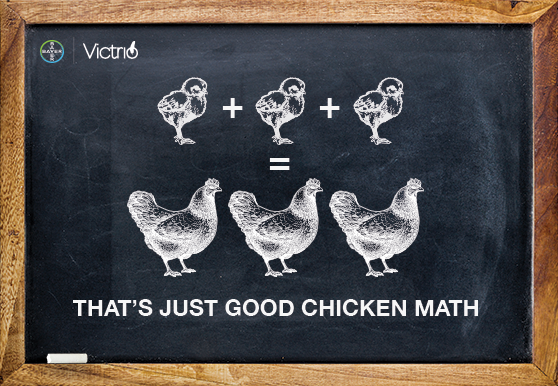 It's simple arithmechick, whether you raise 4,000 chicks or 4 Million. Victrio® is a preservative-free, antibiotic-free way to jump-start your chicks' immune systems, preparing them to fight E. coli the natural way. E. coli is commonly associated with cellulitis1 which causes mortality and condemnations in broiler chickens and is responsible for major economic loss to Canadian broiler producers.2