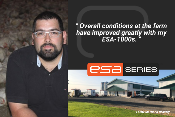 David Mercier grows broiler chickens in Saint-Roch-Ouest, 40 minutes out of Montreal. After installing ESA-1000s to reduce his natural gas costs, he was amazed by the fact that it helped in so many other ways on his farm.