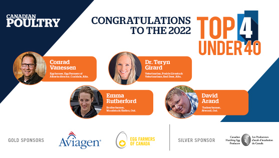 This spring, Canadian Poultry launched our second annual Top 4 Under 40 program, an initiative designed to recognize young poultry leaders. Please join us in congratulating the following four young poultry professionals selected as part of this year's program: David Arand; Dr. Teryn Girard; Emma Rutherford; and Conrad Vanessen.