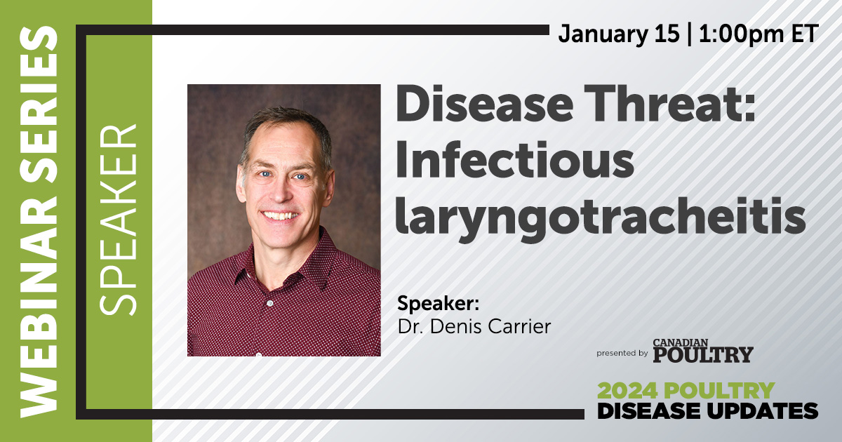 Join us on Jan. 15 for the ILT webinar. Dr. Denis Carrier will provide a comprehensive overview, diagnostic methods and preventative measures for producers to implement to protect their flocks.