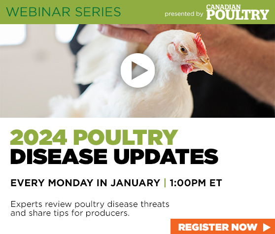 Don’t miss the last half of Canadian Poultry’s exclusive webinar series. Industry comes together on Mondays in January at 1:00pm ET to hear key insights on disease threats.