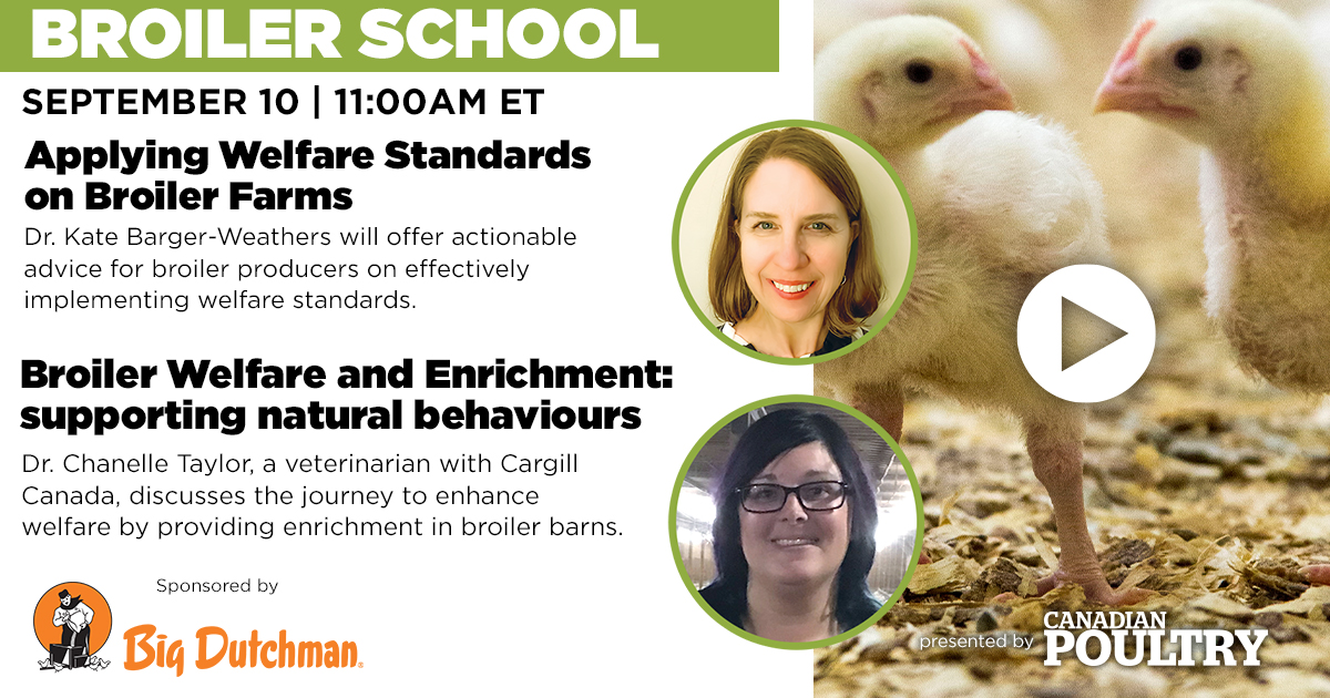 - Dr. Chanelle Taylor, Veterinarian at Cargill Canada, will explore "Broiler Welfare and Enrichment – Supporting Natural Behaviours in the Barn."