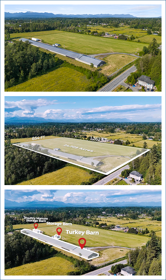 An incredible opportunity to step into—or expand within—the BC Turkey Industry. This fully operational farm includes 1,189,000 kilograms of transferable BC Turkey quota, a meticulously maintained 3-stage barn (72’ x 1014’) built in 2013, and 24.7 flat, cultivated acres with double road frontage along 40th Avenue and 228 Street in Langley.