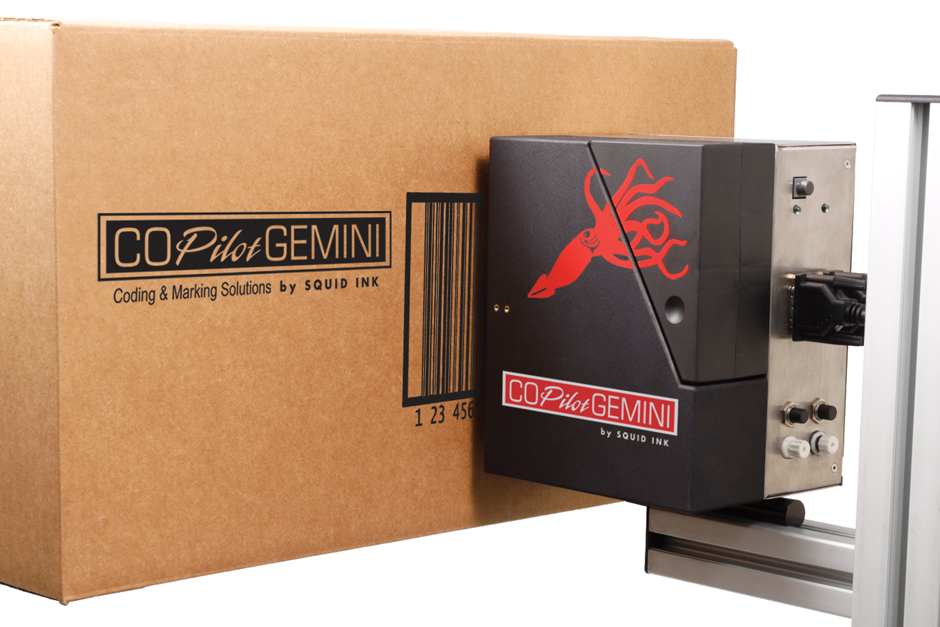 Squid Ink’s CoPilot® Gemini™ printing system is designed to print superior quality hi-resolution characters on porous or non-porous surfaces. For applications that require immediate dry times on non- porous surfaces, the CoPilot Gemini also has the capability to run UV LED curable inks. With a massive 5.6” of print height and print speeds up to 220 ft/ min, the CoPilot Gemini provides a cost effective solution for making your mark on a wide variety of products and substrates.
