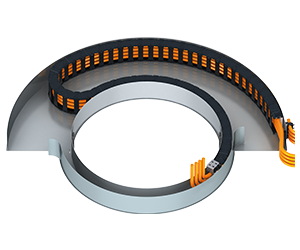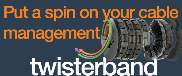 The twisterband system from igus offers a compact solution for rotary cable guidance. Available in 4 sizes, and allowing for more than 7,000 of rotation, twisterband is also easy-to-open, making cable installation and replacement simple.