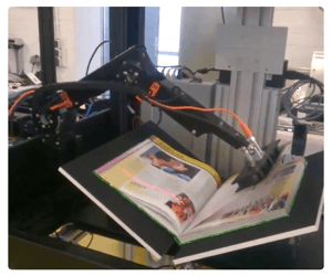In this video, watch a robolink d system being used to automate pages being turned for a book scanner.
