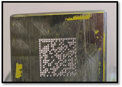 To check the quality of the mark, a 2D camera was used to read it. The camera has a variety of different filters and lighting methods. With these controls, the camera is able to read the mark 100% over 26 passes. While the conical reflections vary, the depth of the mark is sufficient to provide solid readability across the entire mark.