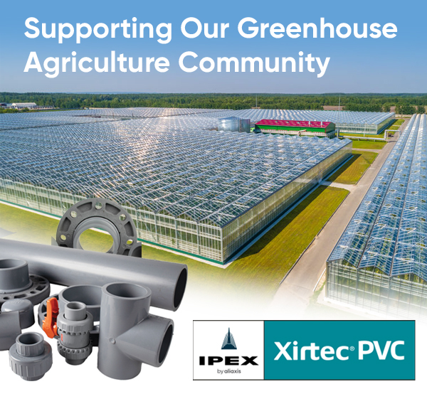 Supporting the greenhouse agriculture irrigation sector, IPEX offers lightweight and sustainable thermoplastic piping systems used to supply water to help grow greenhouse crops with Xirtec® PVC Schedule 40 and 80 pipes, fittings and a wide range of manual and actuated valves.
