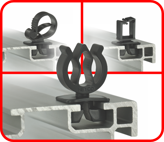 Three styles of secure, releasable and reusable clips work with any 1/2" T-Slot rail and racking system.