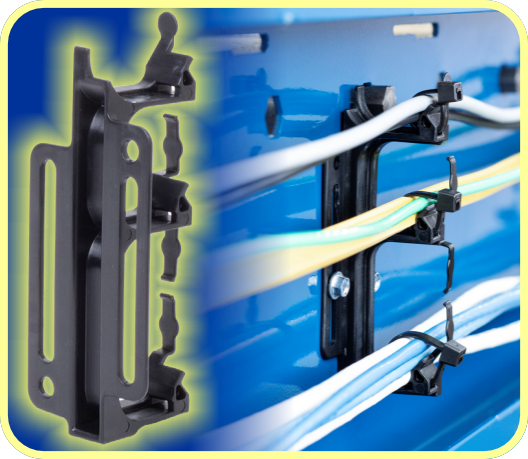 A unique cable management and mounting device used to organize wires and relieve congestion along wire pathways found in conveyor systems and automation equipment.