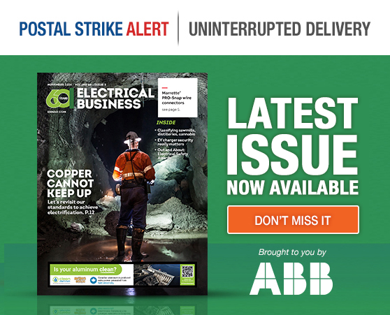 As a valued subscriber to Electrical Business, you are used to receiving the print edition in your mailbox on a regular basis. Given the ongoing Canada Post strike, your next issue may be a bit late. In the meantime, please enjoy the same relevant content but in our easy-to-use digital edition.