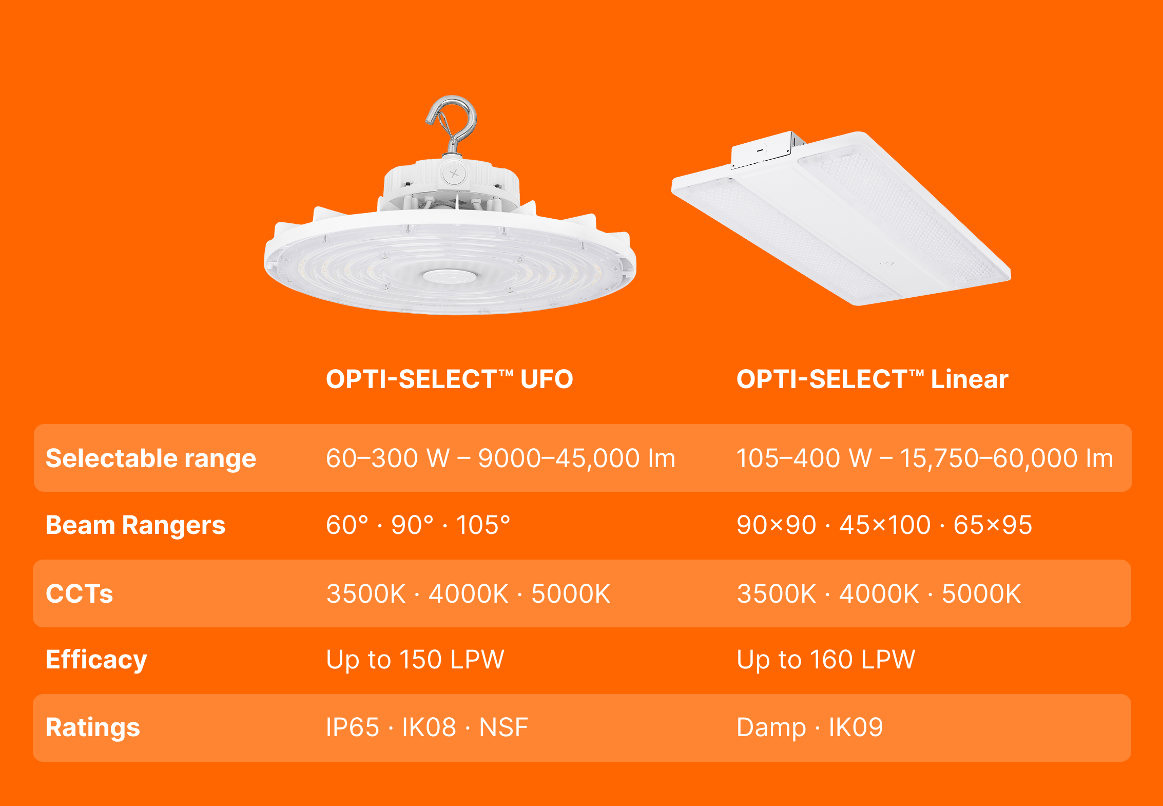 One fixture handles aisles, wide-open floors and everything in between, meaning fewer SKUs to stock and faster installs.