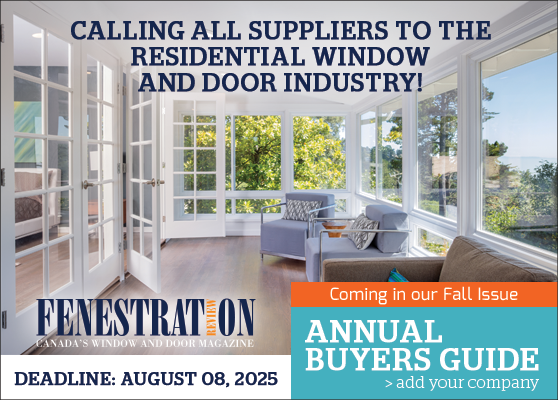 Our annual Buyers Guide showcases top suppliers for the Canadian market and will be featured in our upcoming Fall issue of Fenestration Review. This issue will be distributed to 4,500 qualified window and door fabricators and installers across the country.