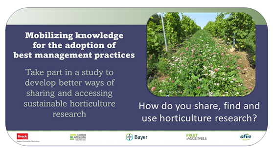 The economic, environmental and social benefits of agriculture best management practices (BMPs) are well known. The successful adoption of BMPs is dependent on having access to useable information. The Niagara Community Observatory at Brock University is conducting a series of surveys in Ontario’s horticulture sector to learn how research about BMPs is shared, accessed, and used. The findings from the research will be used to develop more effective ways of sharing information that support the adoption of BMPs.