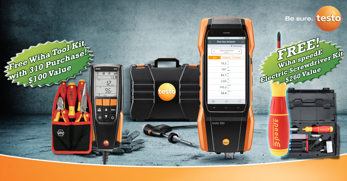 Now through December 31, purchase a new Testo 300 Combustion Analyzer to receive a FREE Wiha speedE Electric screwdriver!! A $260 value! OR purchase a Testo 310 residential combustion analyzer and receive a Wiha Tool Set with your purchase!!
