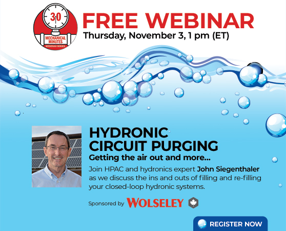 Join HPAC Magazine and John Siegenthaler for our next episode of 30 Mechanical Minutes where we’ll discuss the ins and outs of circuit purging – getting the air out when filling or re-filling a hydronic system.
