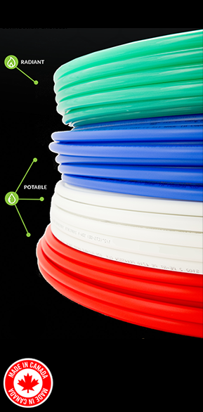 White, red and blue choices for Potable water and VIPERT Radiant green for Oxygen Barrier, available tubing sizes: 3/8” through 2” diameters.