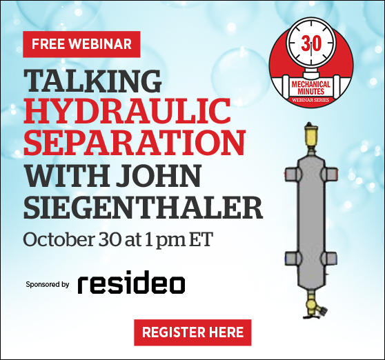 The conversation will touch on closely-spaced tees, buffer tanks and low loss headers. We'll be packing a lot into this 30-minute session, but there will also be time to answer your questions. So please register today for this valuable learning opportunity.