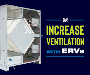 One mode of SARS-COV2 exposure is inhalation of fine droplets and aerosols carrying virus. Improper ventilation can result in pathogen buildup, while increased ventilation can dilute pathogens out. RenewAire energy recovery ventilation (ERV) can increase ventilation while reducing energy costs by reusing otherwise-wasted energy. Available in many sizes/configurations, RenewAire ERVs include EC Fans, boost-mode for on-demand increased ventilation and controls.