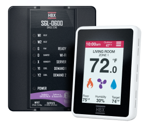 HBX Control Systems The HBX Single Zone (SGL-0600) is designed to control most common HVAC systems and provides flexibility to integrate heating or cooling systems with multiple devices including forced air heating/cooling, radiant heating/cooling, heat pumps, fancoils and humidifier/dehumidifier.