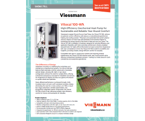 Viessmann’s newest Ground Source Heat Pump, the Vitocal 100‑WA, delivers exceptional comfort, efficiency and value as a comprehensive geothermal heating and cooling solution. The Vitocal 100‑WA is available in five sizes, designed for extreme efficiency and application flexibility, with field‑reversible controls and a factory‑installed desuperheater for highly efficient domestic hot water production.
