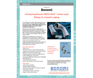 The “PRESS MAX” system is Bonomi North America’s newest addition to its press fitting line. Applications include hydronics, natural gas, low pressure steam, lubricants/oils, chilled water, fuel oils, fire sprinkler systems and compressed air. “PRESS MAX” is ideal for ASTM carbon steel pipe in schedule 10 to 40, and other pipe including ASTM A53, A106, A135, and A795.