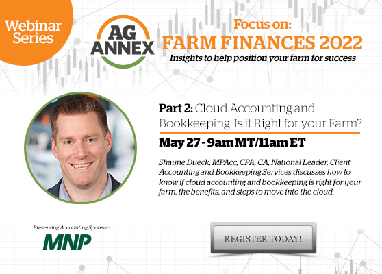 Shayne Dueck, MPAcc, CPA, CA, national leader, client accounting and bookkeeping services with MNP, discusses how to know if cloud accounting and bookkeeping are right for your farm, the benefits of moving to the cloud, and steps to take to make this transition.