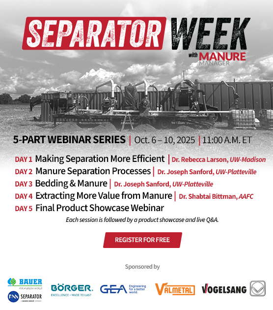 Separator Week delivers five days of FREE webinars from leading manure minds, bringing you research on types of separation processes – and knowing what’s right for you – and how to get the most bang for your separation buck.