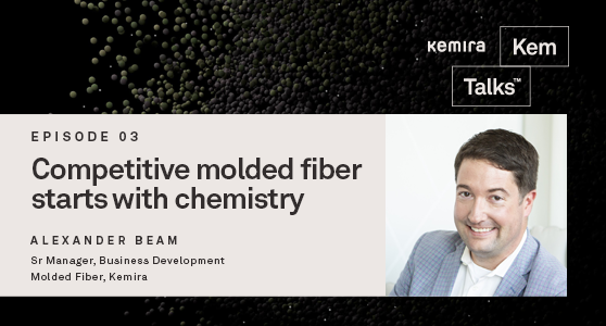 Welcome to KemTalks, an expert-led video podcast series featuring ~30-minute interviews with Kemira specialists. In this episode Alexander Beam, Senior Manager of Business Development for Molded Fiber, discusses how the right chemistry tackles critical production challenges in molded fiber – from improving cycle times to enhancing packaging strength and barrier properties.