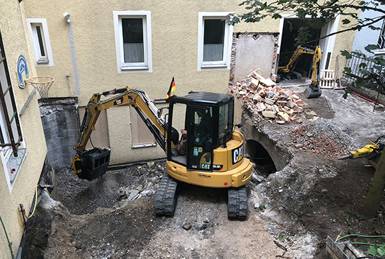 When the only way to access a construction site inside a courtyard is through a narrow door and the only machine that fits is a 5 tons mini-excavator. How do you process demolition debris at the site?