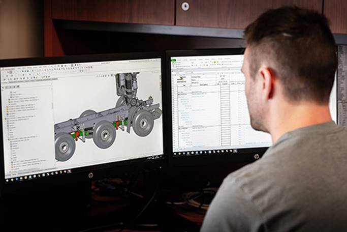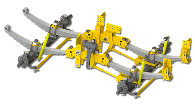 | Simard Suspensions’ front end solutions include a twin-steer front suspension, which increases payload, maximizes tire and steering component performance; a spring tridem front suspension, which boost lateral satiability; and an air front suspension, which offers superior traction on sloping or rough terrain. |