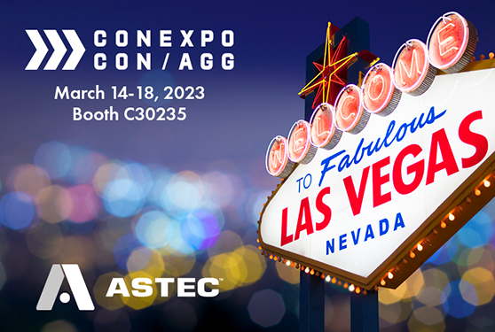 | The largest construction show in North America is taking over Las Vegas March 14-18 and Astec will be there to connect with you. As a manufacturer of more than 100 machines for asphalt roadbuilding, aggregate processing, and concrete production, Astec’s portfolio of Rock to Road®  products is second to none. Come see our latest equipment. Learn how Astec Digital  can transform your business. And connect with experts in your field committed to helping you succeed.