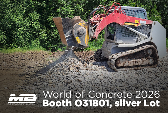 Visit us to explore solutions that help you to recycle concrete waste on the job, cut hauling and disposal costs, reduce the need for virgin aggregate, lower CO₂ emissions, improve efficiency using your existing equipment. And this is just the start of what MB Crusher attachments can do. See our full lineup of bucket crushers, demolition pulverizers, and sorting grapples in action at World of Concrete 2026, January 19–22, 2026 – Las Vegas Convention Center, Booth O31801 – Silver Lot.