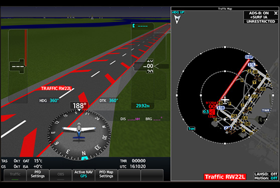 Runway Occupancy Awareness leverages ADS-B traffic data to predict and alert pilots of potential runway incursions from nearby airborne aircraft or other aircraft on or approaching the runway. Visual and aural alerts are provided on the pilot’s primary flight display and 3D SafeTaxi™ map to maximize situational awareness, a safety feature that is especially useful at busy airports.