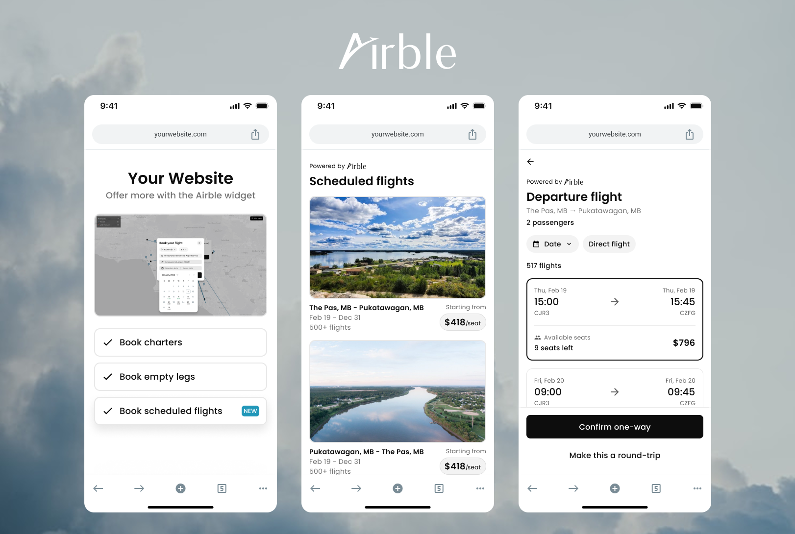 In February 2026, Airble expanded the booking widget’s capabilities with a newly added feature: real-time scheduled flight bookings, opening access to an additional market segment. Missinippi Airways is the first official partner to offer scheduled flights through the booking widget, alongside charter options and empty leg deals.